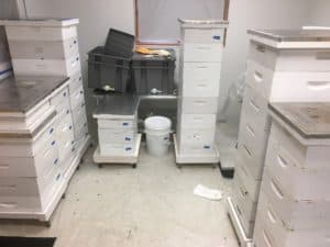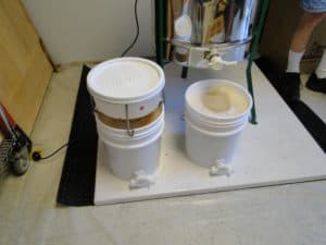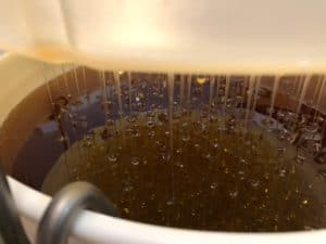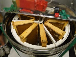 Once the bees have capped the frames in a honey super, the frames are harvested and are transported back to our honey extraction room. When beekeeping and honey extracting, we remove the cappings and put the frames into an extractor which spins the frames at high speed. The honey is flung out of the cells and exits the extractor where it runs through a mesh screen. The screen removes large wax shavings from the cappings and miscellaneous debris from the honey. The screen allows all the good stuff (pollen, nutrients, enzymes, etc.) through while removing undesirables.